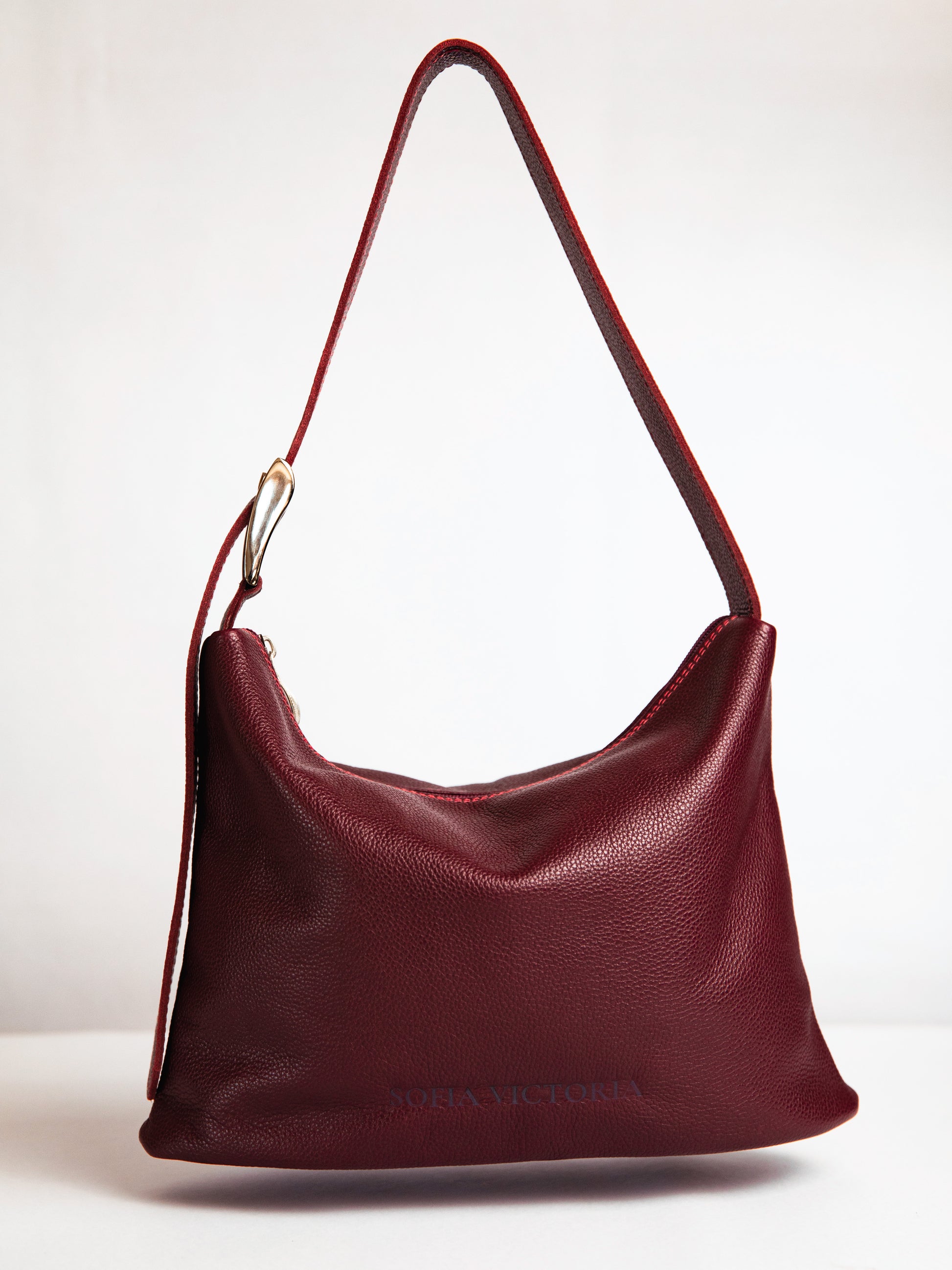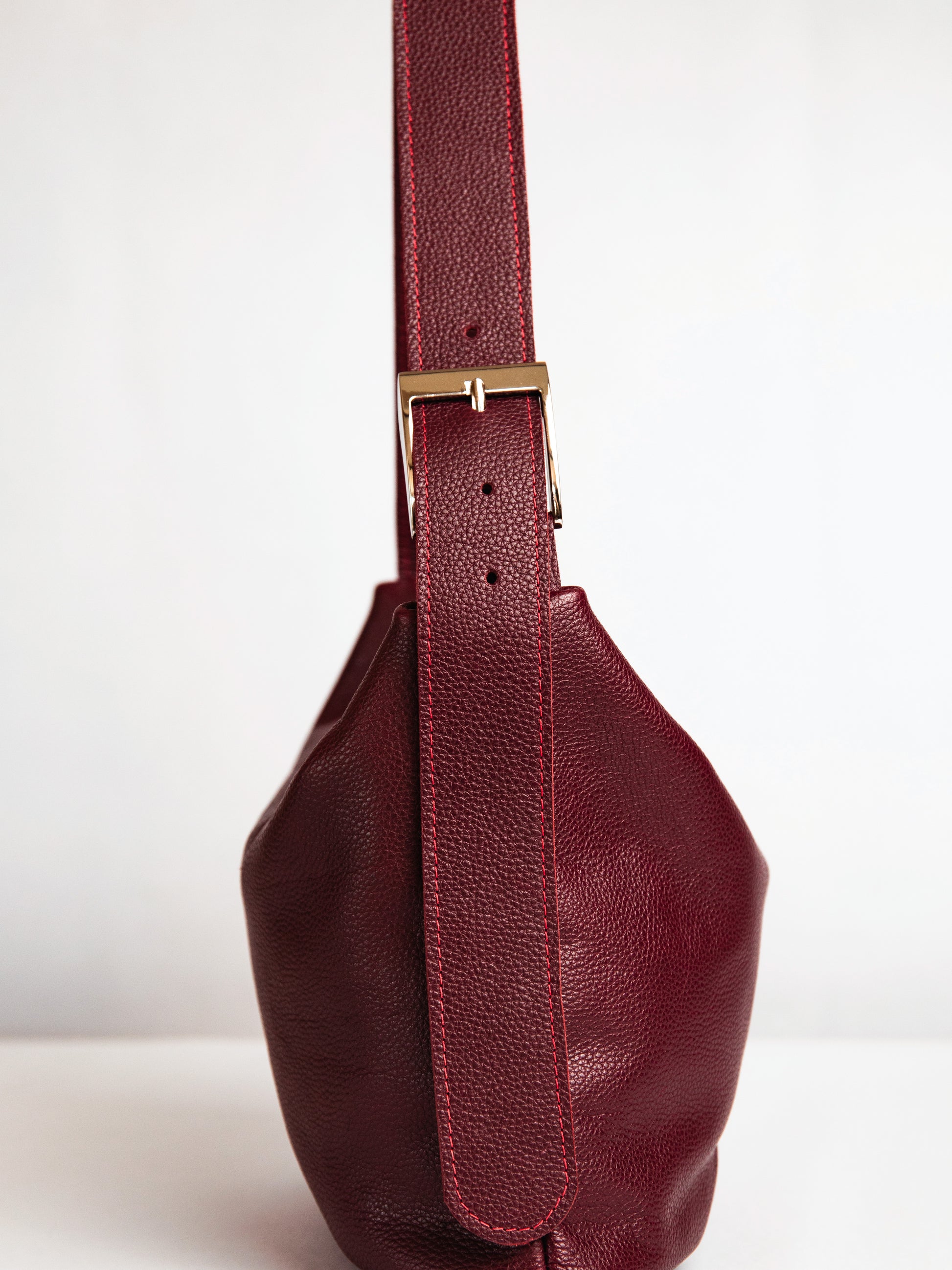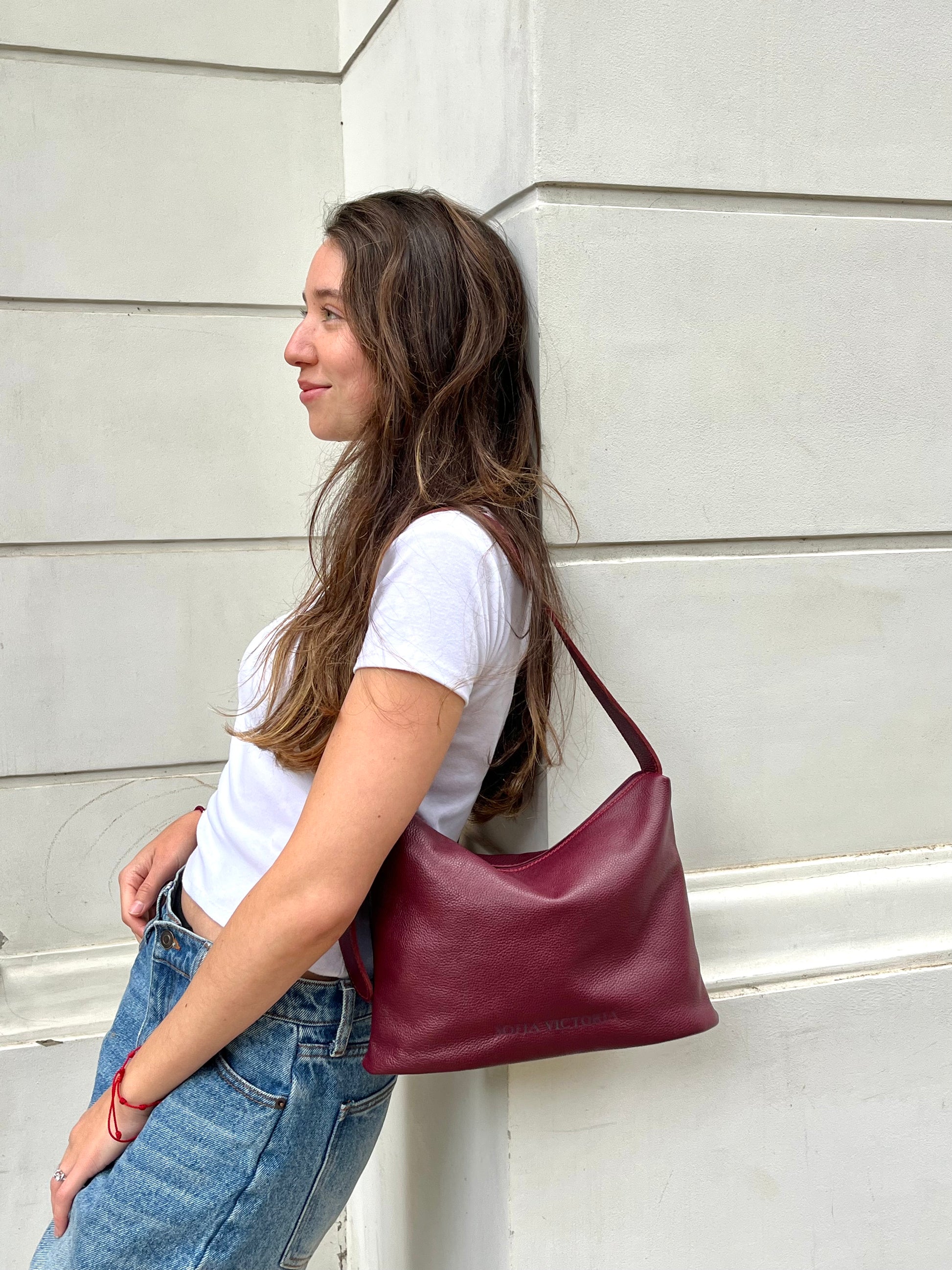 Cartera al hombro ajustable con hebilla, cuero graneado Vino. Este bolso combina la funcionalidad y estilo en una pieza atemporal. Su diseño compacto es ideal para el día a día, con espacio suficiente para llevar lo esencial sin perder comodidad.