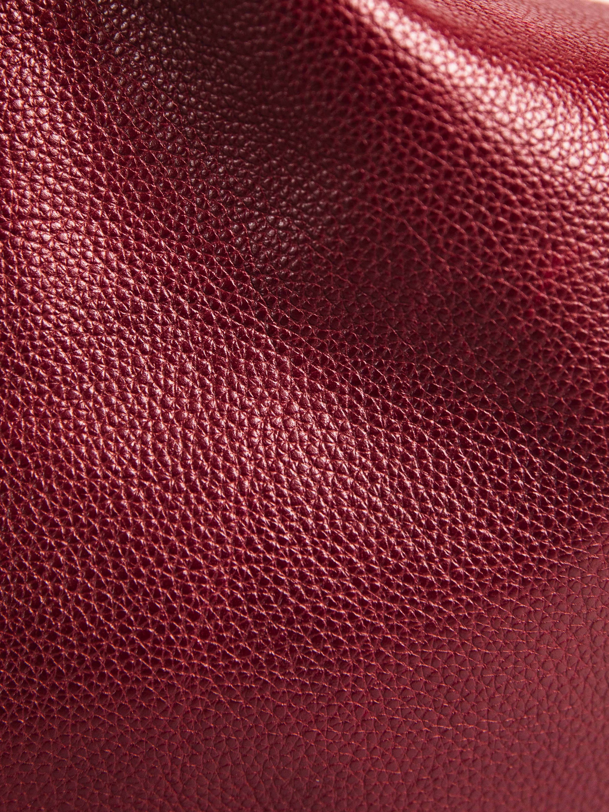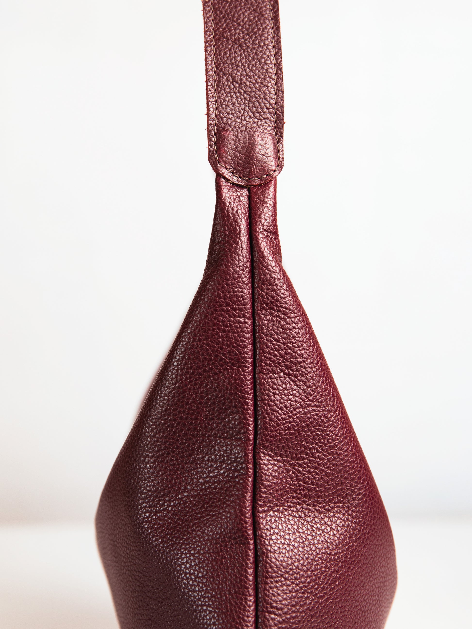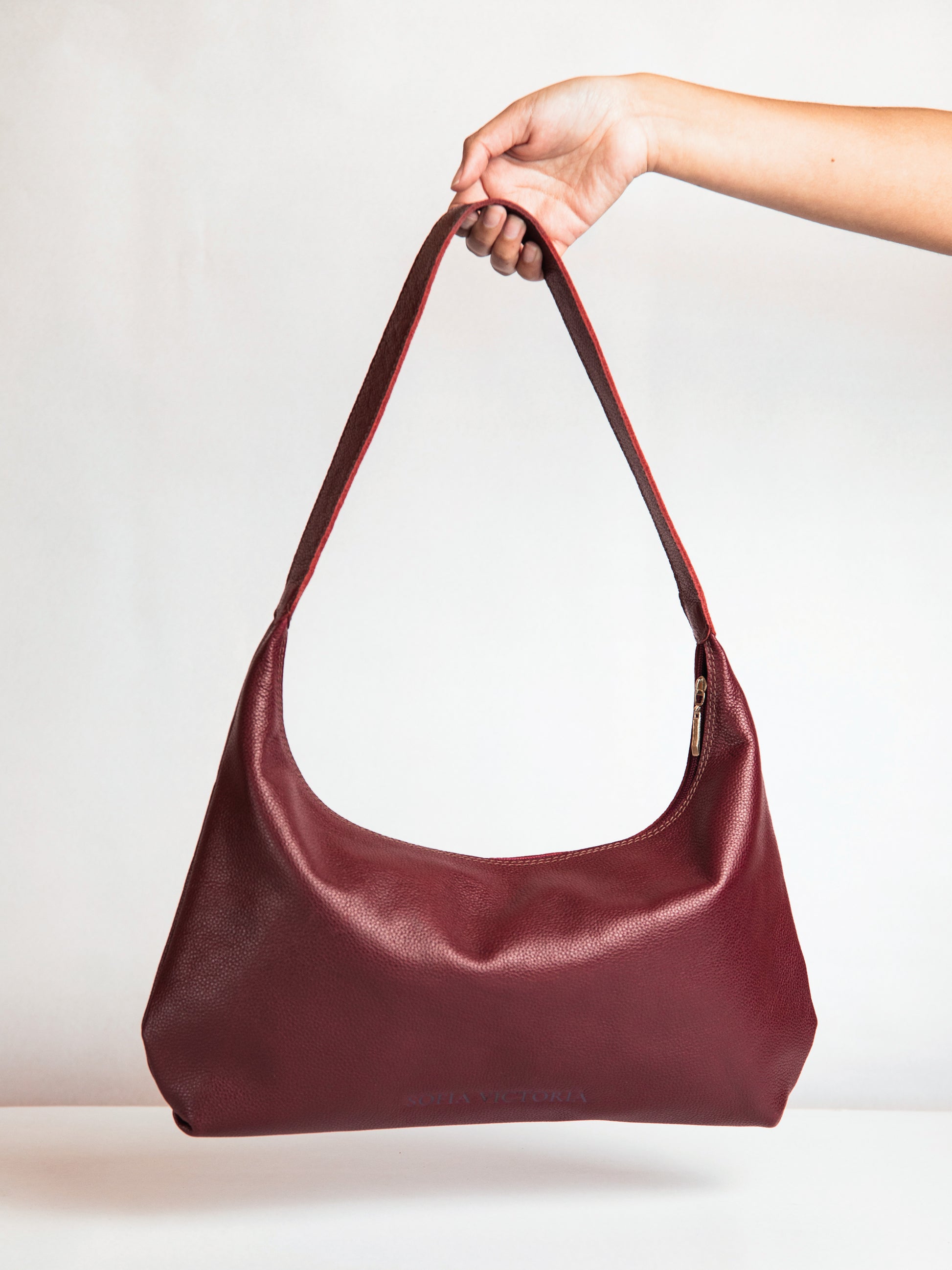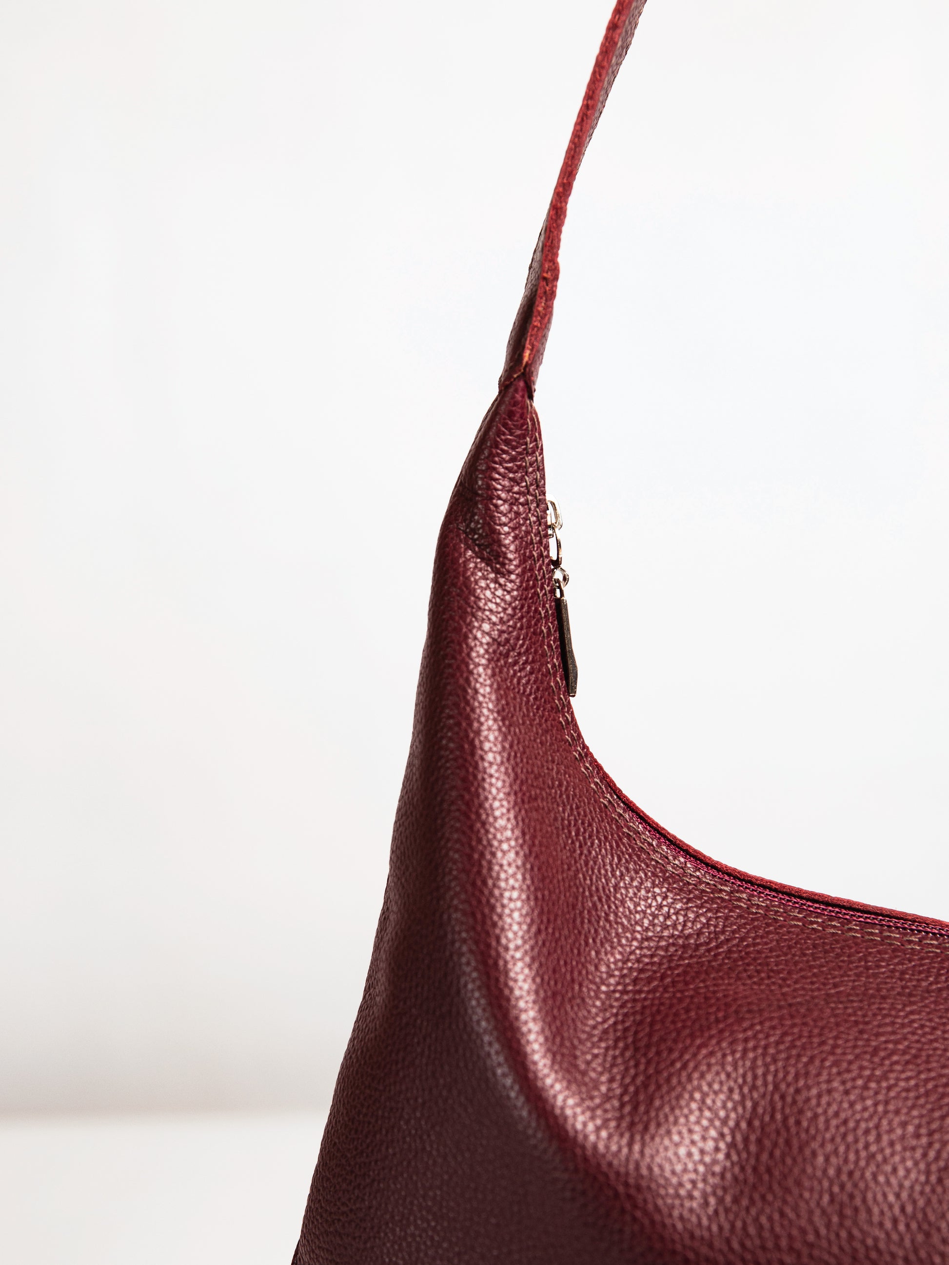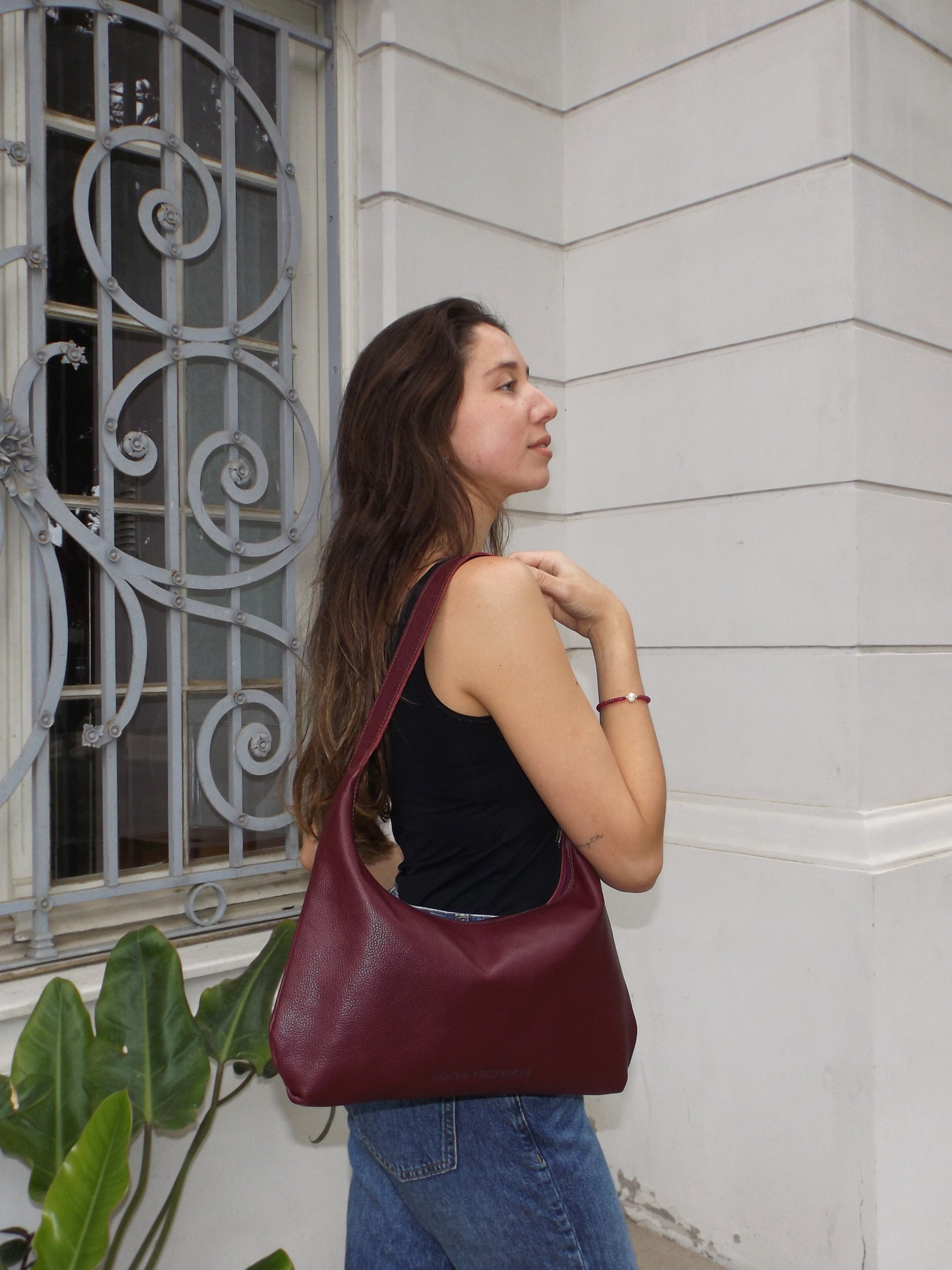 Cartera al hombro. cuero graneado Vino. Este bolso destaca por su diseño limpio y funcional, ideal para el uso diario. Su tamaño compacto ofrece el equilibrio perfecto entre comodidad y espacio, permitiéndote llevar lo esencial con estilo.